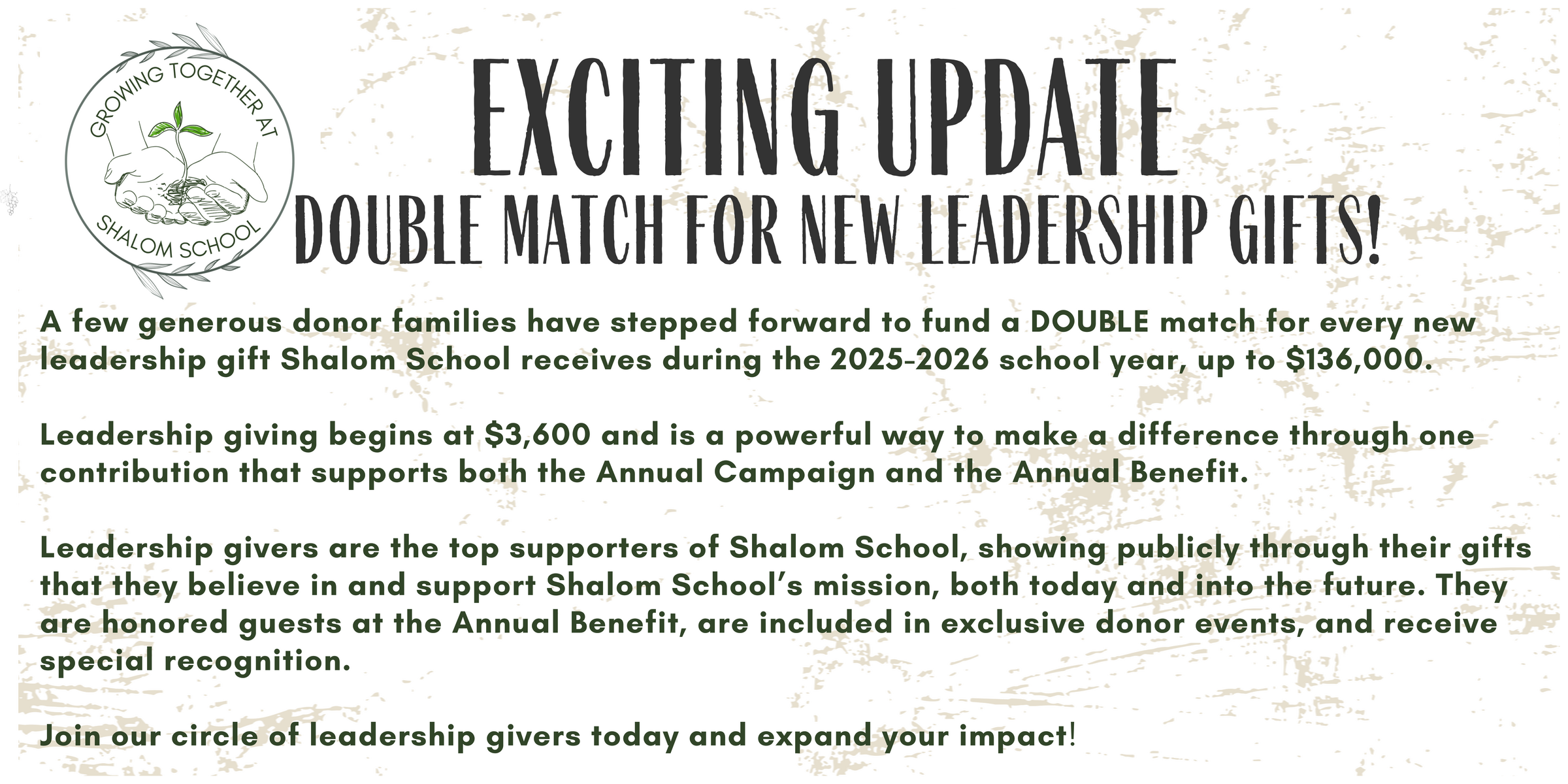 Students of all ages grow together at Shalom School because of the incredible level of financial support received from our community. Shalom School’s Annual Campaign enables our dedicated professional staff and lay leadership to deliver a top-notch program infused with the academic excellence, rich experiences, loving environment, and Jewish joy that is unique to our school community.